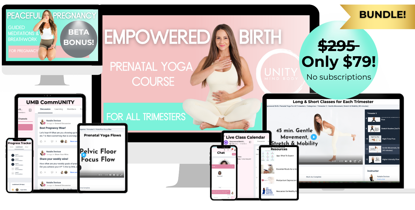 The Empowered Birth Prenatal Yoga Course is a comprehensive, step-by-step program designed to guide you through each stage of pregnancy with ease, strength, and confidence. Through safe and effective yoga flows, guided meditations, and expert insights, you’ll prepare for a smoother, healthier pregnancy and a more positive birth experience.